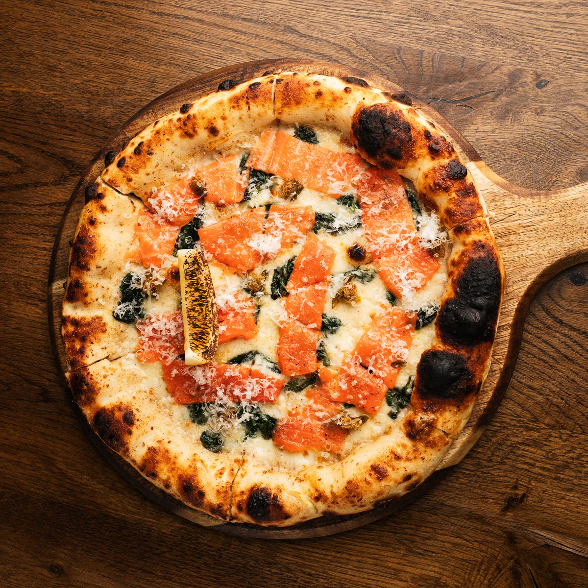 Вершково-горіхова основа, моцарела, бланшований шпинат, лосось, маринований у лимонній олії,…