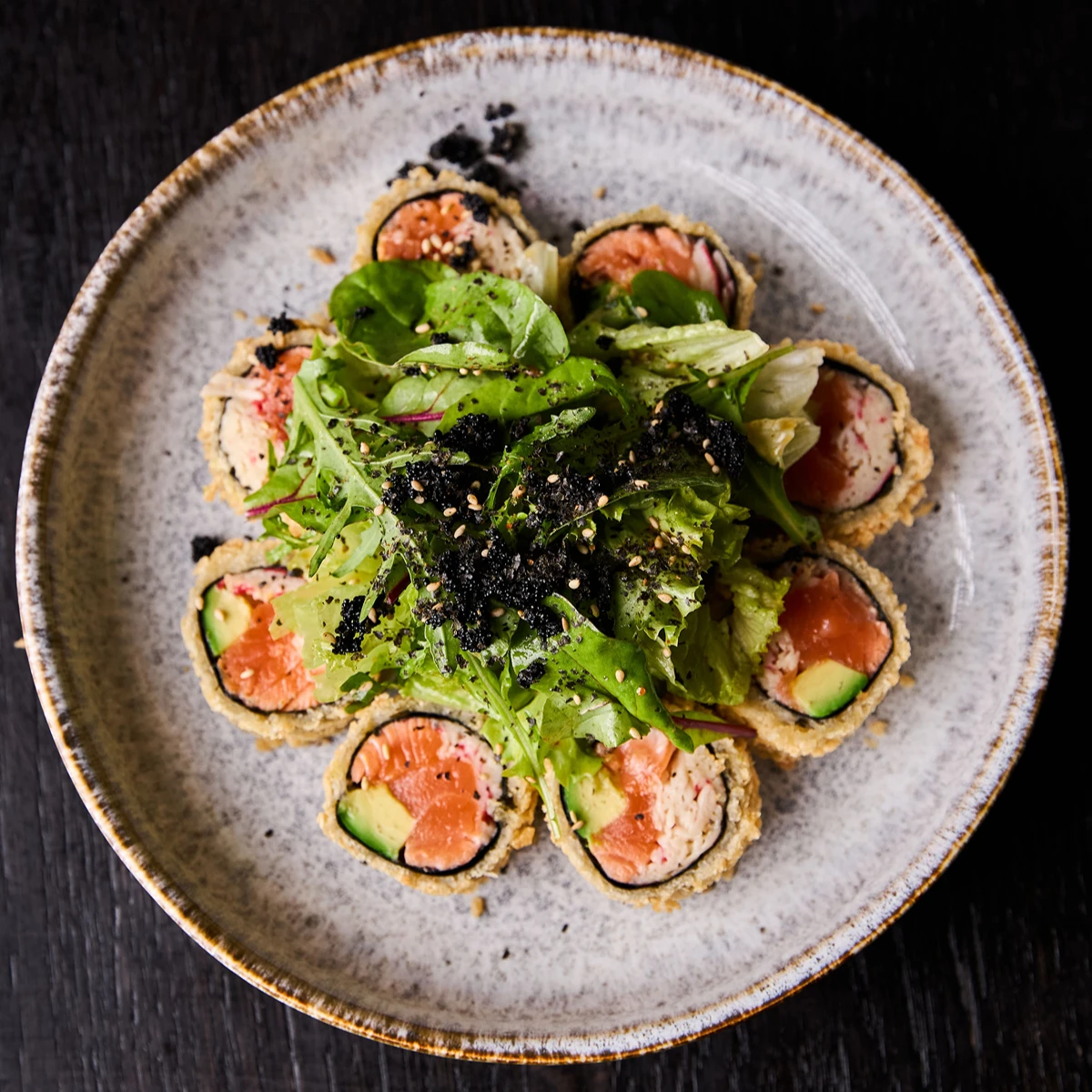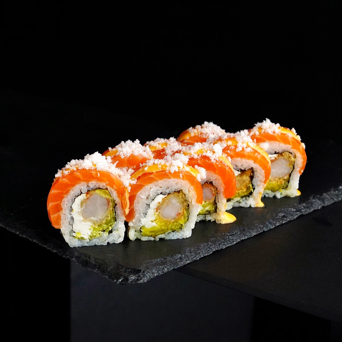 Лосось, креветка темпура, крем-сир, дайкон (японська редька), пікантний соус на…
