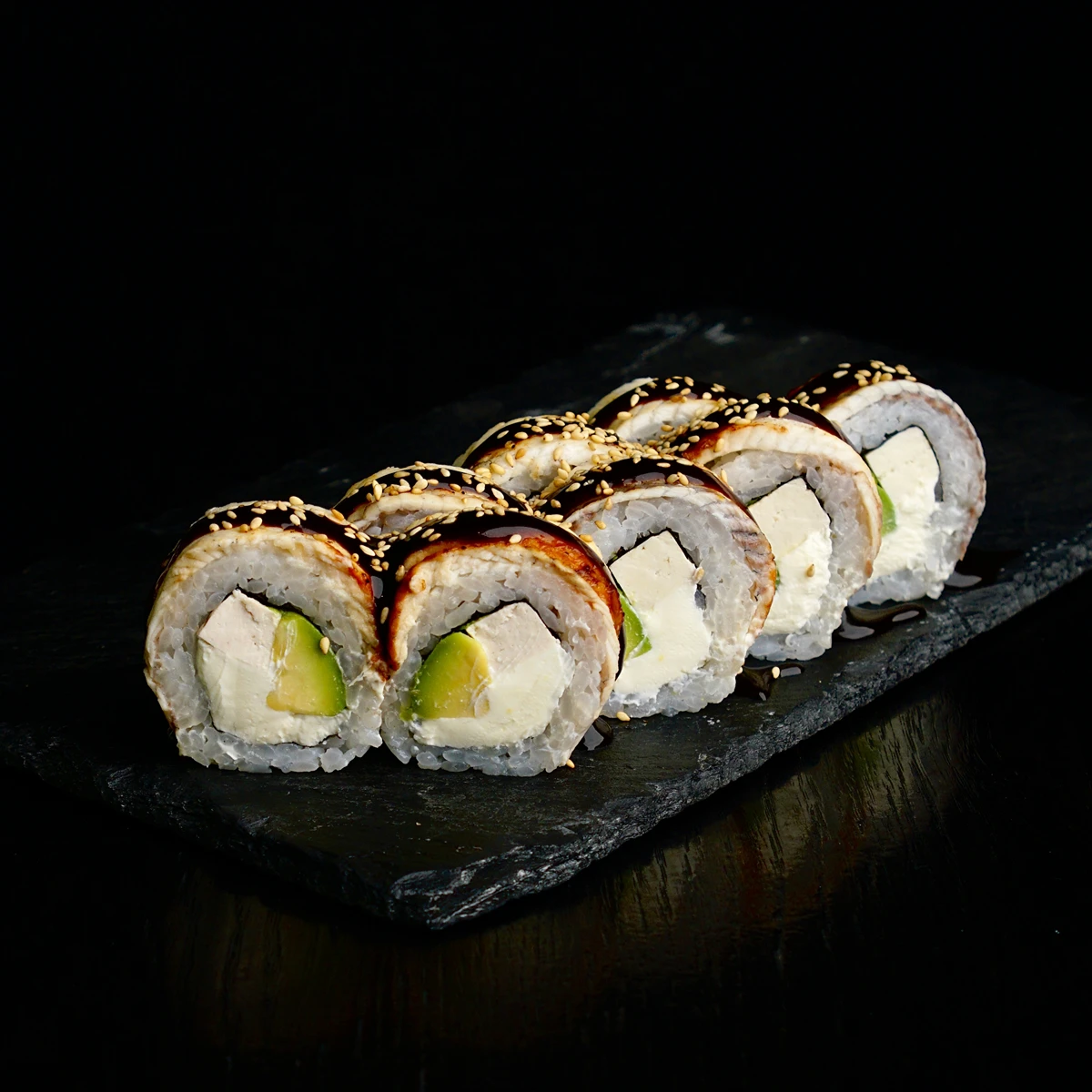 вугор, сир філадельфія, авокадо, сир тофу, соус унагі, кунжут