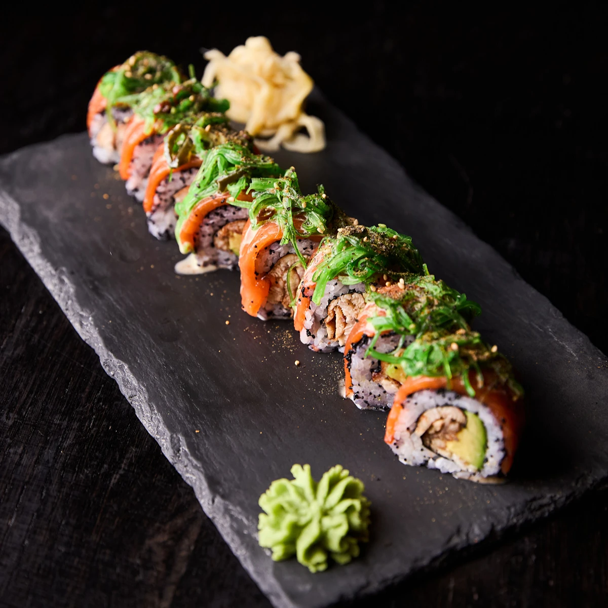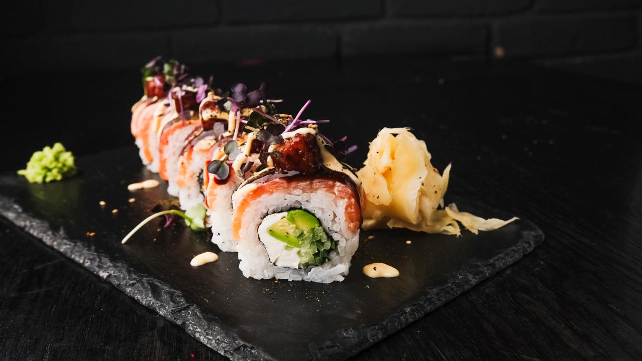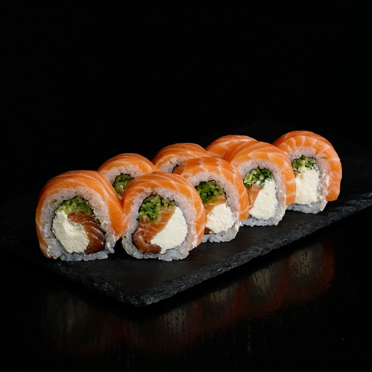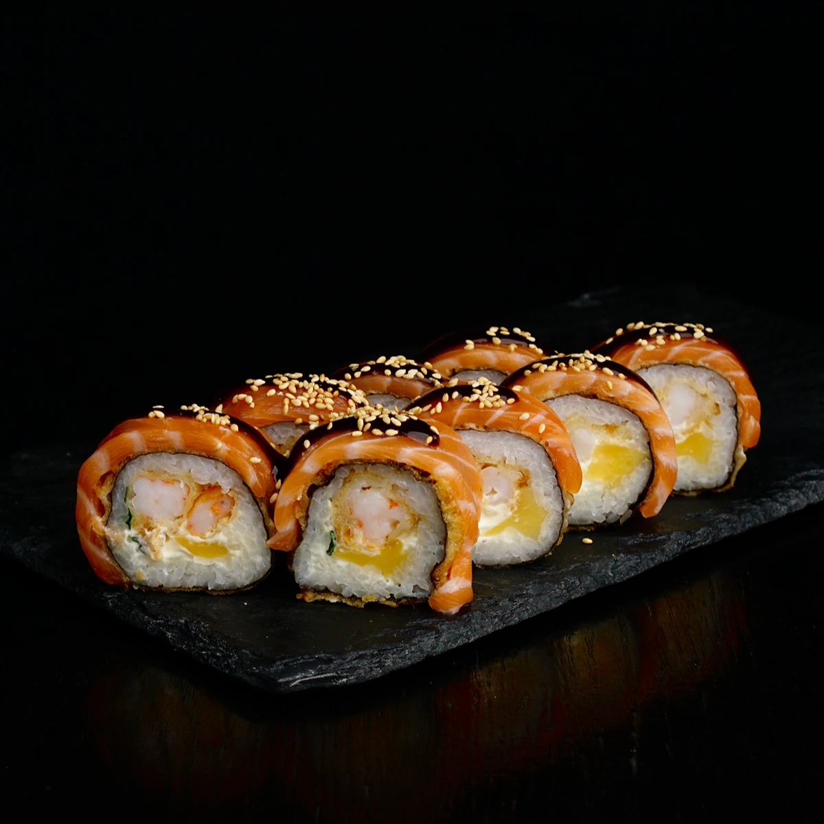 Лосось, огірок, крем-сир, авокадо, гострий айолі, карамелізована свинина в соусі…