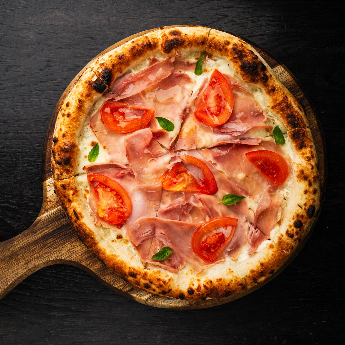 Томатна основа, прошутто котто, печериці, моцарелла, маслини, оливки, артишоки, каперси,…