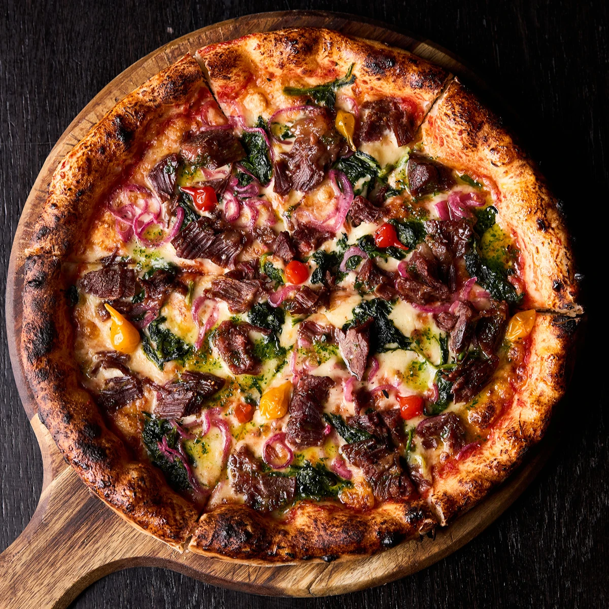 Томатна основа, моцарела, яловичі щоки, солодкий маринований перець, маринована цибуля,…