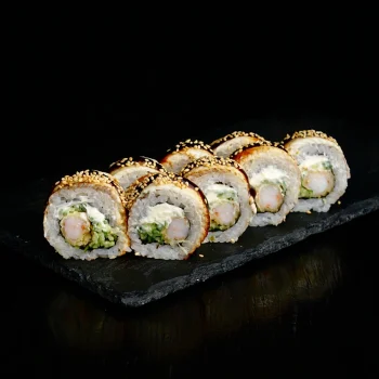 вугор, сир філадельфія, авокадо, сир тофу, соус унагі, кунжут